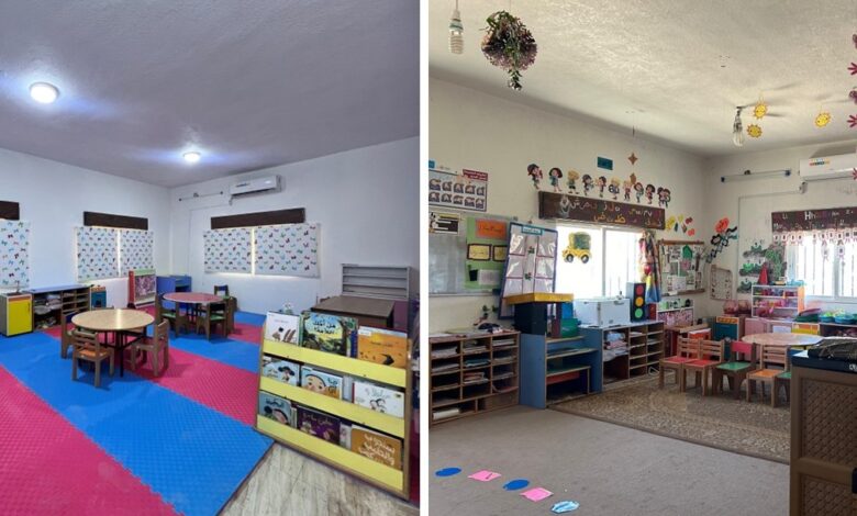 وشملت عملية إعادة تأهيل المدرسة أعمال الطلاء لصفوف المدرسة البالغ عددها 8 صفوف، بالإضافة إلى الممرات والساحات الخارجية والأبواب، وتنفيذ عدد من الجداريات، وإصلاحات في المرافق الصحية والأماكن المخصصة لمياه الشرب، وتجديد التمديدات الكهربائية وإضافة وحدات إنارة جديدة، وتأسيس فتحات أعلى أبواب الصفوف الدراسية بما يسمح بدخول ضوء الشمس، إضافة إلى زراعة المساحات الخارجية في المدرسة لزيادة الرقعة الخضراء وتعزيز البيئة الصحية، فيما تم إجراء أعمال صيانة عامة للأثاث المدرسي والأسوار وغيرها من المرافق.